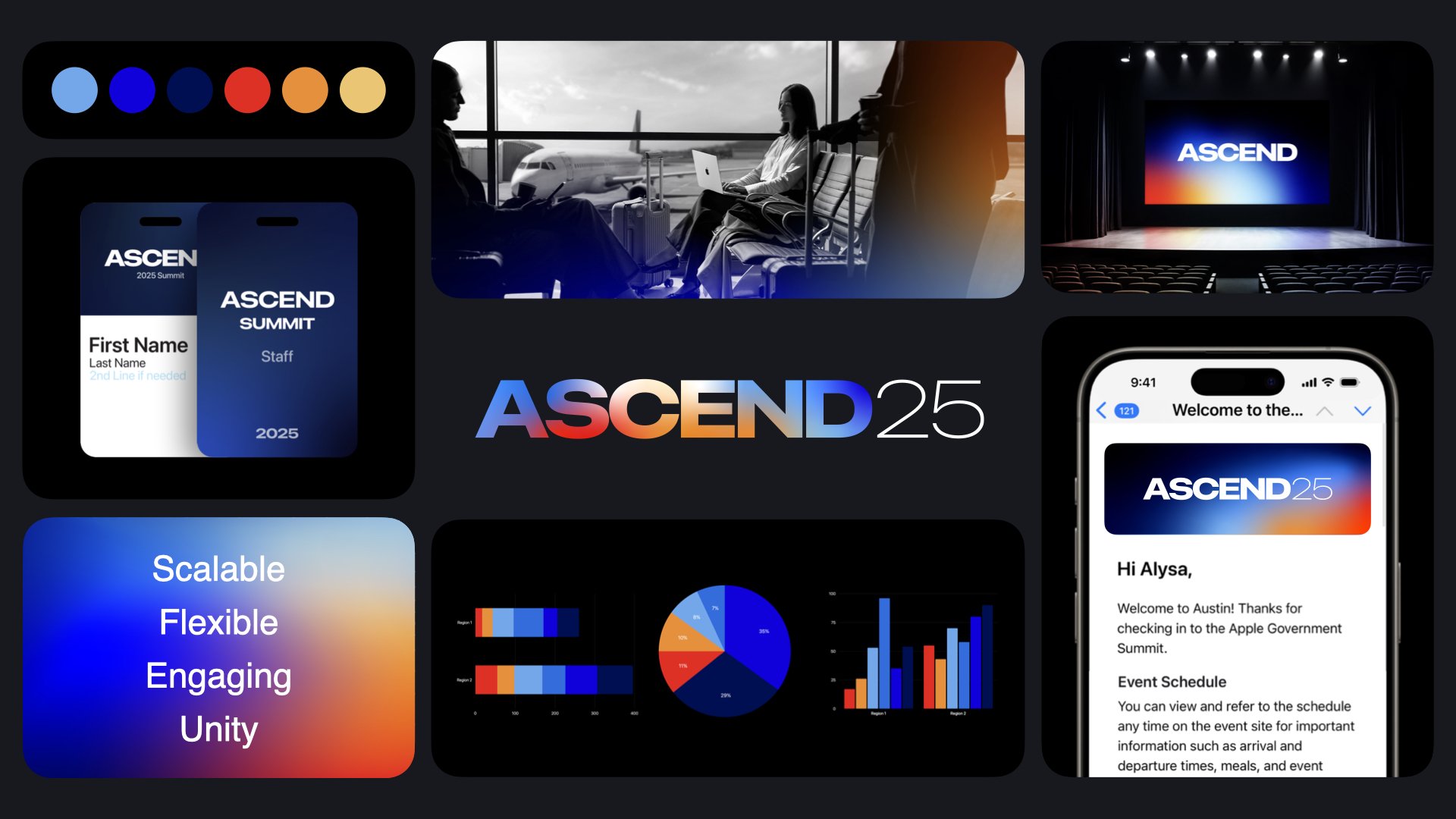 I designed the branding for Ascend25. This event is one of many Industry events that are hosted by the WW Industry and Partnerships team at Apple. Ascend 2025 is an aviation focused event, bringing together partners, airlines, solutions, and more. Delivered a Keynote template, video loops, digital assets, and guidance for way-finding at event site.