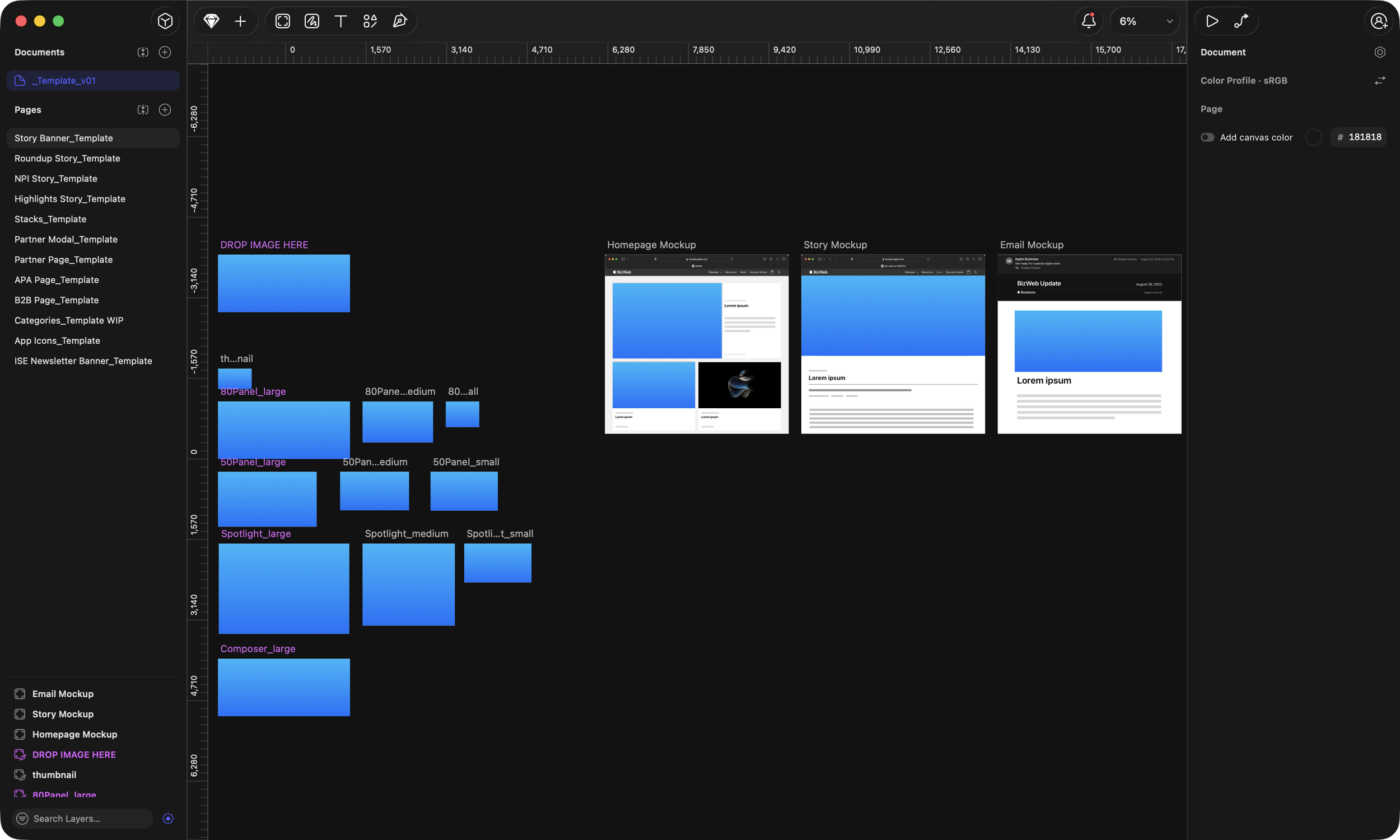 I used the Sketch app to design a template that creates all image renditions for Mac, iPad and iPhone views, with one single image. In addition, I built mockups to get a preview of how the art will look on the website and newsletter.