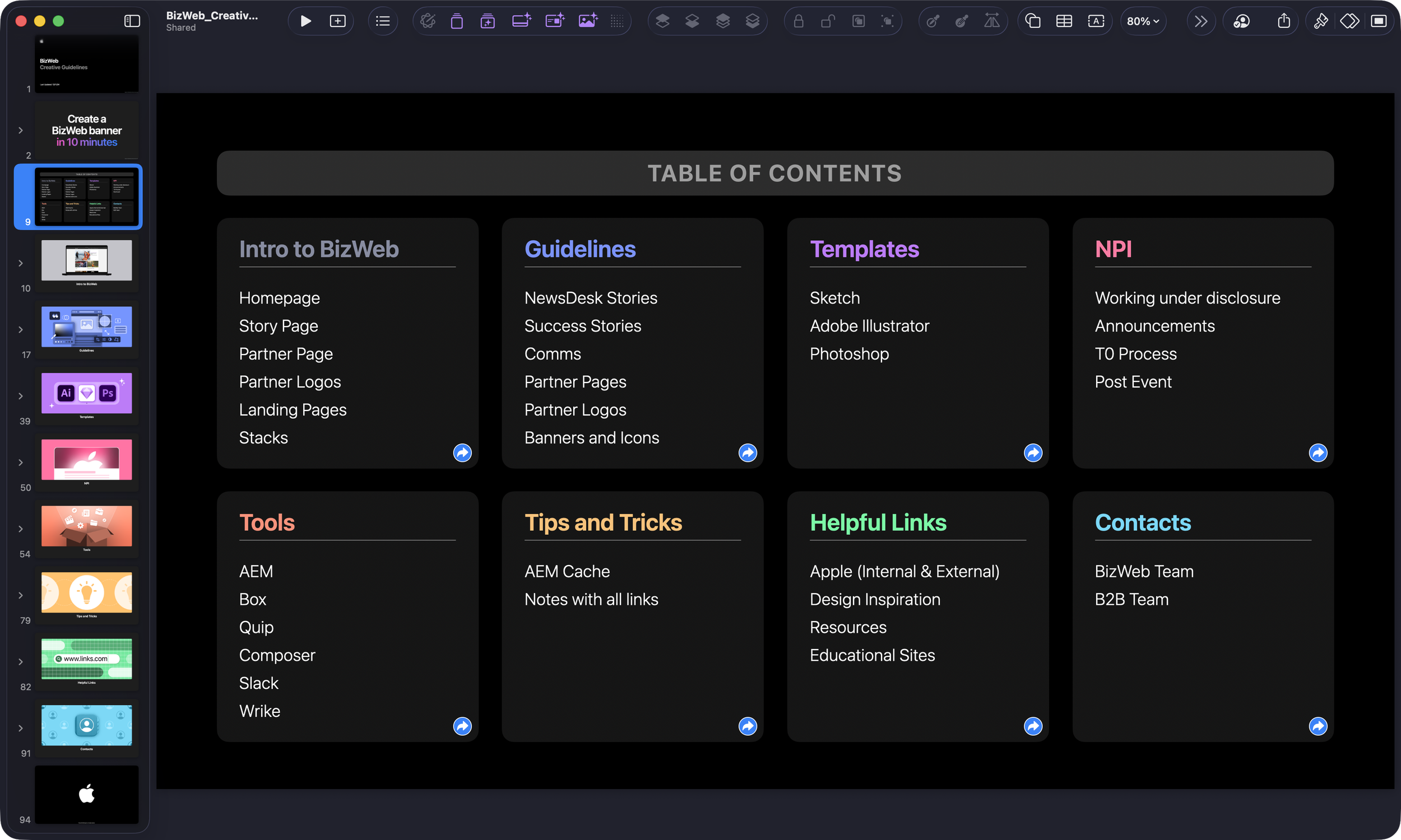 Below is a keynote document outlining what BizWeb is, guidelines on stories, how to use templates, information about tools, processes and some tips and tricks to successfully output designs on BizWeb.
